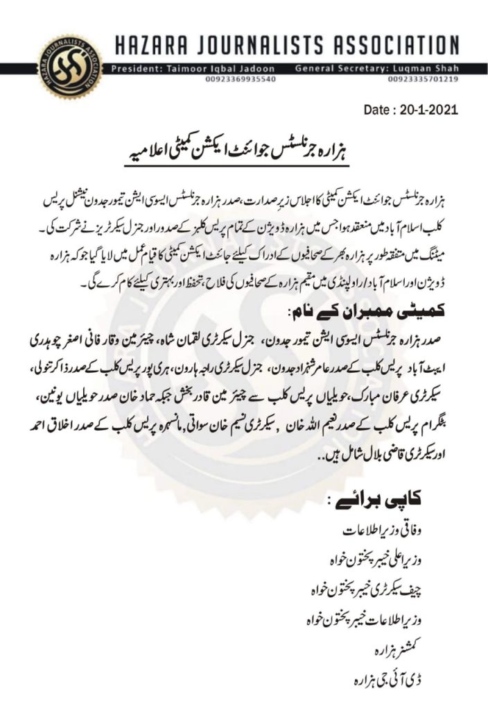 اجلاس میں ایک مشترکہ ایکشن کمیٹی تشکیل دینے کی منظوری دی گئی جس میں اسلام آباد سے ایسوسی ایشن کے چیئر مین وقار فانی, صدر تیمور جدون, جنرل سیکرٹری لقمان شاہ, اصغر چوہدری جبکہ ایبٹ آباد پریس کلب کے صدر عامر شہزاد جدون, جنرل سیکرٹری راجہ ہارون, ہری پور پریس کلب کے صدر ذاکر تنولی, سیکرٹری عرفان مبارک, حویلیاں پریس کلب سے چیئر مین قادر بخش جبکہ حماد خان صدر حویلیاں یونین. بٹگرام پریس کلب کے صدر نعیم اللہ خان, سیکرٹری نسیم خان سواتی,مانسہرہ پریس کلب کے صدر اخلاق احمد اور سیکرٹری قاضی بلال شامل ہیں جبکہ ہزارہ کے باقی پریس کلبز سے مندوبین کو ایکشن کمیٹی میں بعد میں شامل کیا جائے گا.