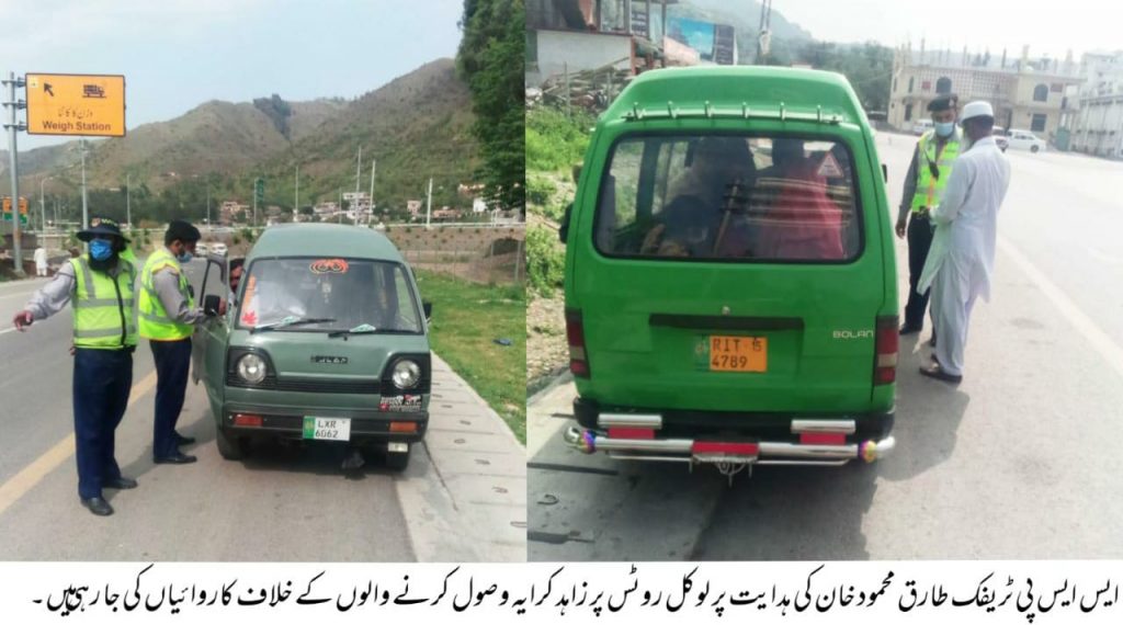 تفصیلات کے مطابق صوبائی حکومت کے احکامات پر آئوٹ ڈسٹرک گاڑیوں پر پابندی کے دوران ایبٹ آباد شہر میں لوکل گاڑیوں پر زیادہ کرایہ وصول کرنے والوں کے خلاف عوامی شکایات کا نوٹس لیتے ہوئے ایس ایس پی ٹریفک طارق محمود خان نے جملہ سیکٹر انچارجوں کو سخت ہدایات جاری کیں کہ جو بھی گاڑی زاہد کرایہ وصول کرے اسکے خلاف سخت کاروائی عمل میں لائی جائے جس پر فوراً ایکشن لیتے ہوئے ٹریفک پولیس ایبٹ آباد کی طرف سے شہر میں مختلف مقامات پر سخت ناکہ بندیاں لگائیں گئیں اور زاہد کرایہ وصول کرنے والے ان ڈرائیوز کے خلاف سخت قانونی کاوائی کرتے ہوئے بھاری جرمانے عائد کیے گئے