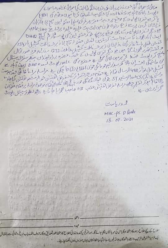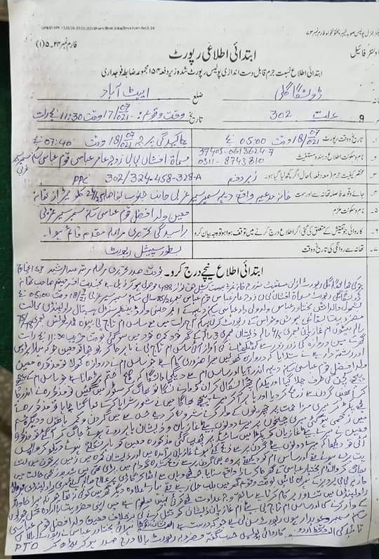واقع کی اطلاع ملتے ہی ڈی ایس پی گلیات جمیل قریشی اور ایس ایچ او تھانہ ڈونگاگلی علی خان جدون نفری کے ہمراہ موقع پر پہنچ گئے اور تینوں لاشوں کو قبضے میں لے کر پوسٹ مارٹم کے لیے ڈی ایچ کیو ہسپتال منتقل کر دیا جبکہ زخمی افشاں کو زخمی حالت میں مری ہسپتال منتقل کر دیا جہاں حالت تشویشناک ہونے پر خاتون کو راولپنڈی ریفر کر دیا جبکہ تینوں نعشوں کو پوسٹ مارٹم کے بعد ورثا کے حوالے کر دیا گیا ڈونگا گلی پولیس نے زخمی لڑکی کی مدعیت میں زیر دفعہ 302/324/458/328 A کے تحت مقدمہ درج کرکے واقعے کی تفتیش شروع کر کے ملزم کو گرفتار کر لیا ملزم کو گزشتہ روز عدالت کے روبرو پیش کیا گیا مقتولیں کی طرف سے نوجوان قانون دان اویس عباسی ایڈوکیٹ پیش ہوئے کیس کی پیروی کرتے ہوئے ملزم کا عدالت سے چار روزہ جسمانی ریمانڈ حاصل کرتے ہوئے پولیس کے حوالے کر دیا پولیس کے مطابق ملزم سے تفتیش جاری ہے جس سے مزید اہم انکشافات متوقع ہیں ملزم کی پیشگی کے موقع پر پولیس کی بھاری نفری تعینات تھی